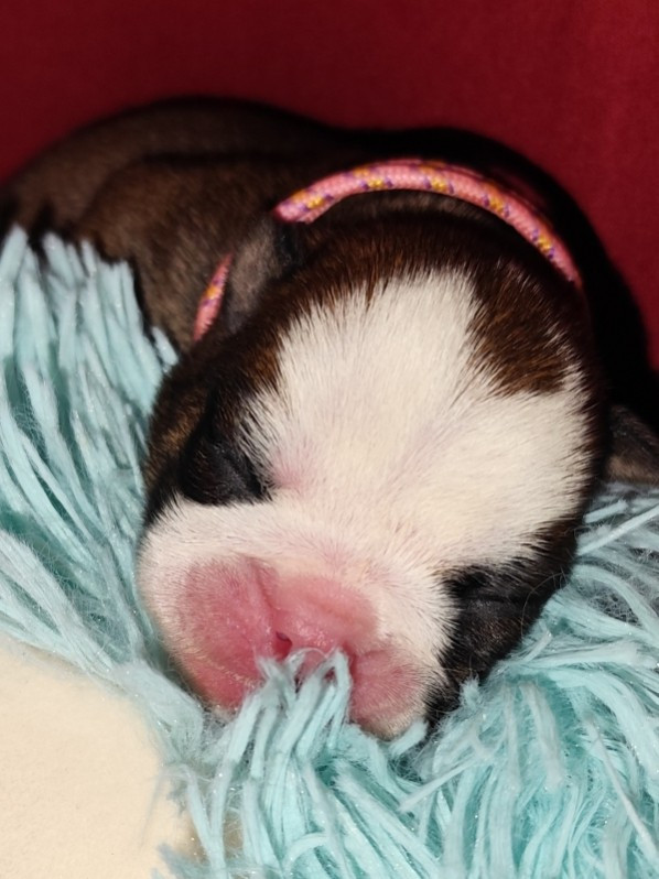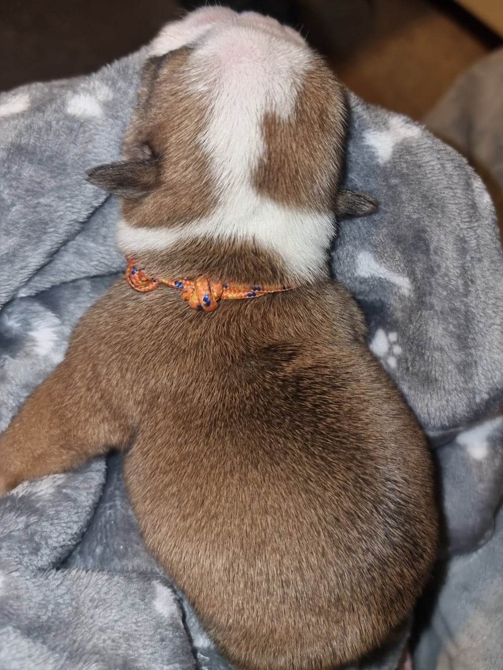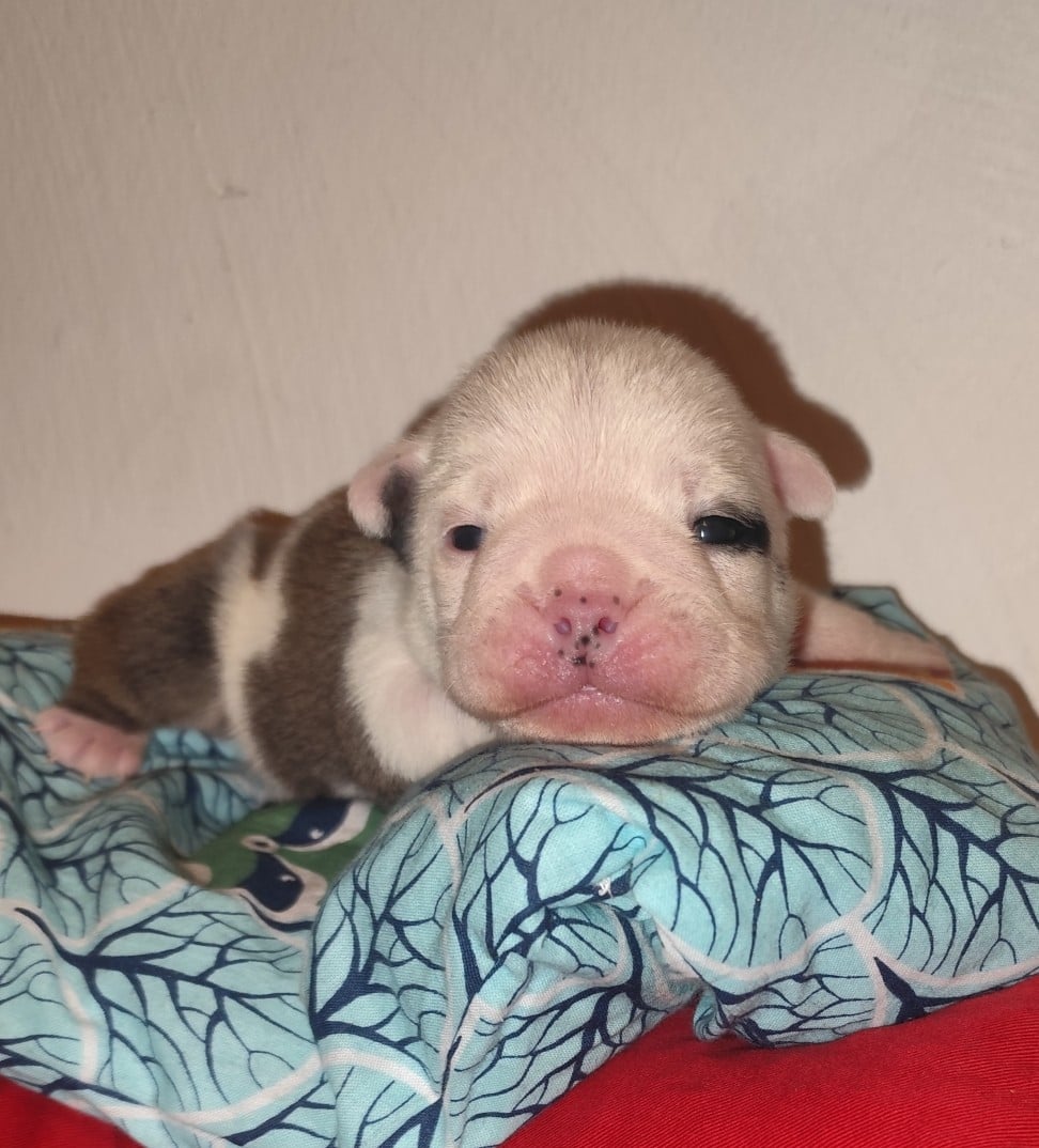 ContactBriana Hopp est une jolie femelle Bulldog Anglais, bien typée dès la naissance, avec un poids de 371g . Elle présente une belle robe fauve panachée de blanc, avec une pigmentation déjà bien marquée. Son corps est compact et harmonieux, avec une ossature solide et un dos bien proportionné. lignée clos de stefanel