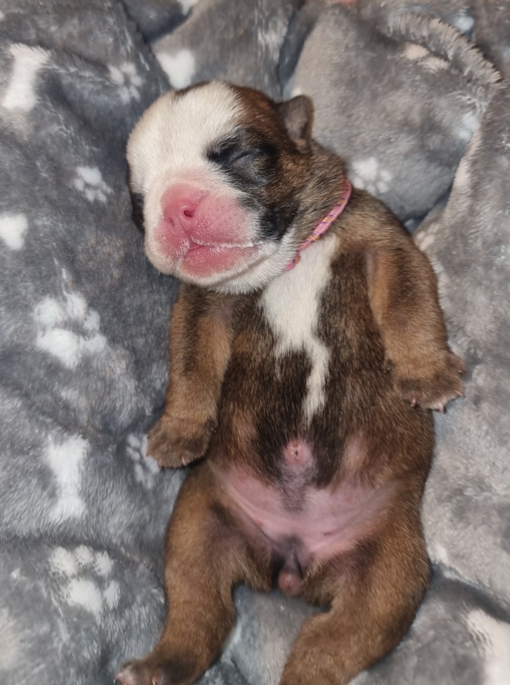Atlana a donné naissance à une magnifique portée de 5 chiots bulldog anglais : 2 mâles et 3 femelles, tous nés naturellement avec de très beaux poids de naissance et trés belle lignée du clos de stefanel.