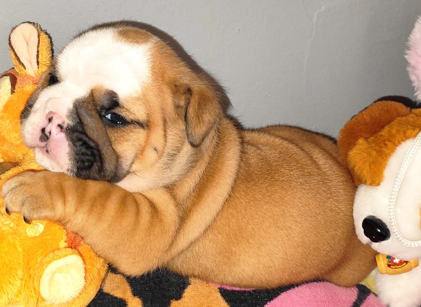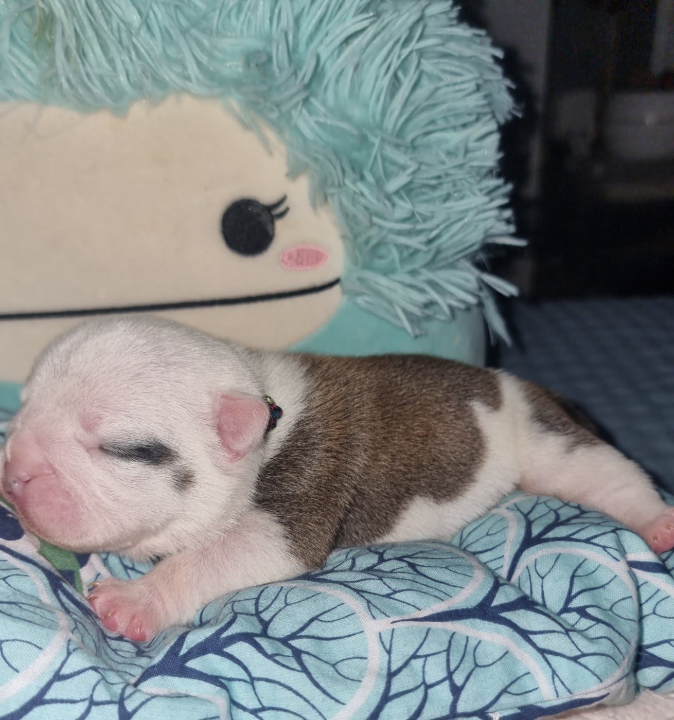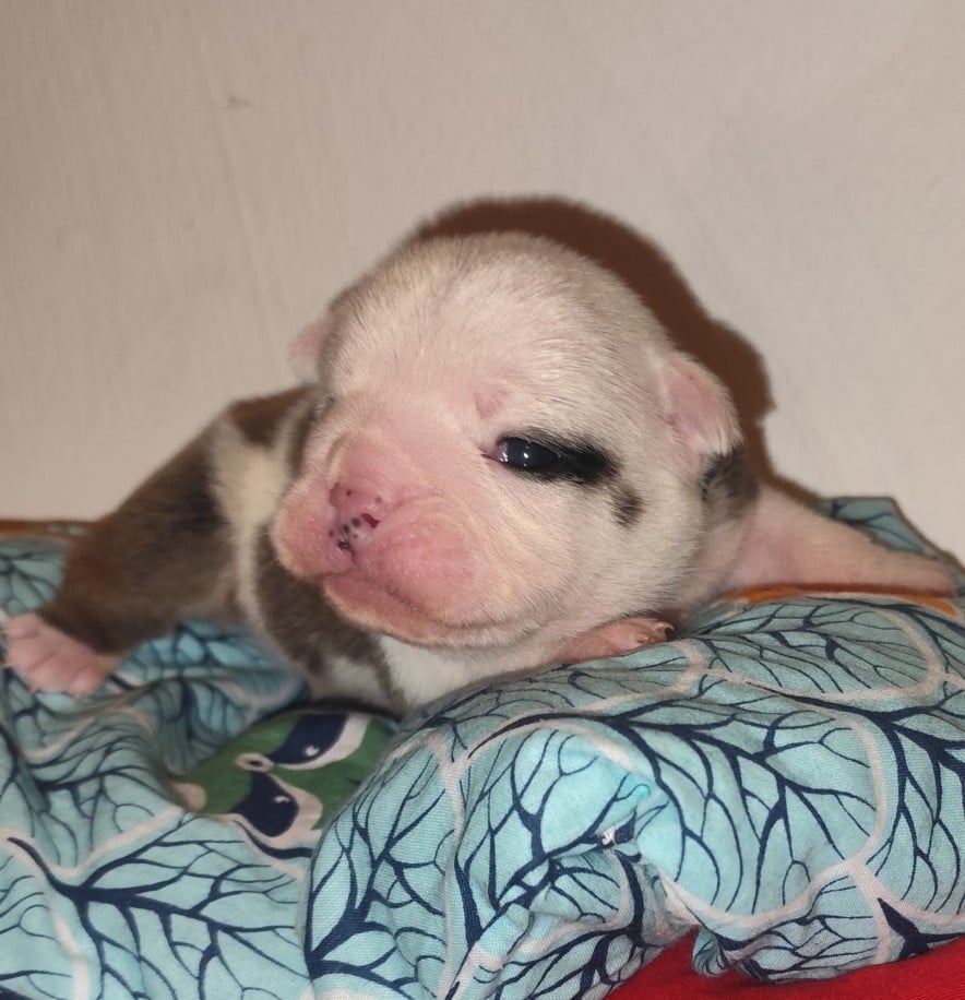 Blake Harrison Mâle bulldog anglais au pelage fauve panaché de blanc. Il présente une tête marquée, avec un rond sur le crâne, des oreilles légèrement marron et de beaux yeux cocards, lui donnant une expression déjà très typée. Sa morphologie est bien proportionnée dès la naissance. Poids de naissance : 319 g.