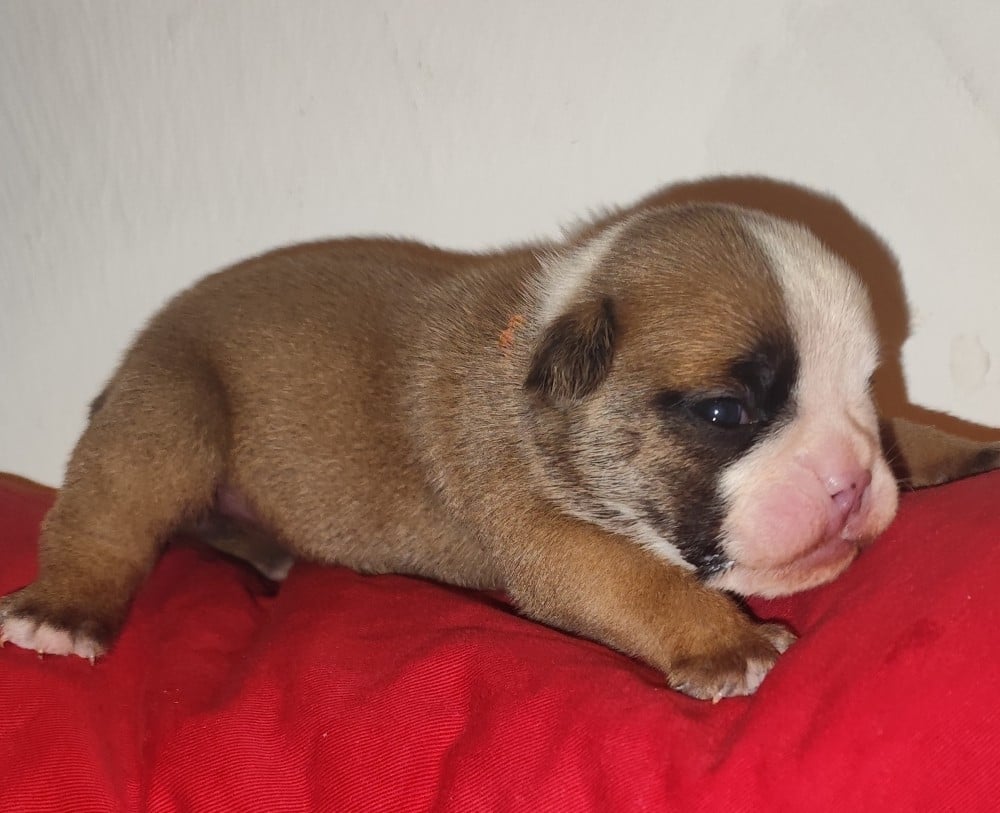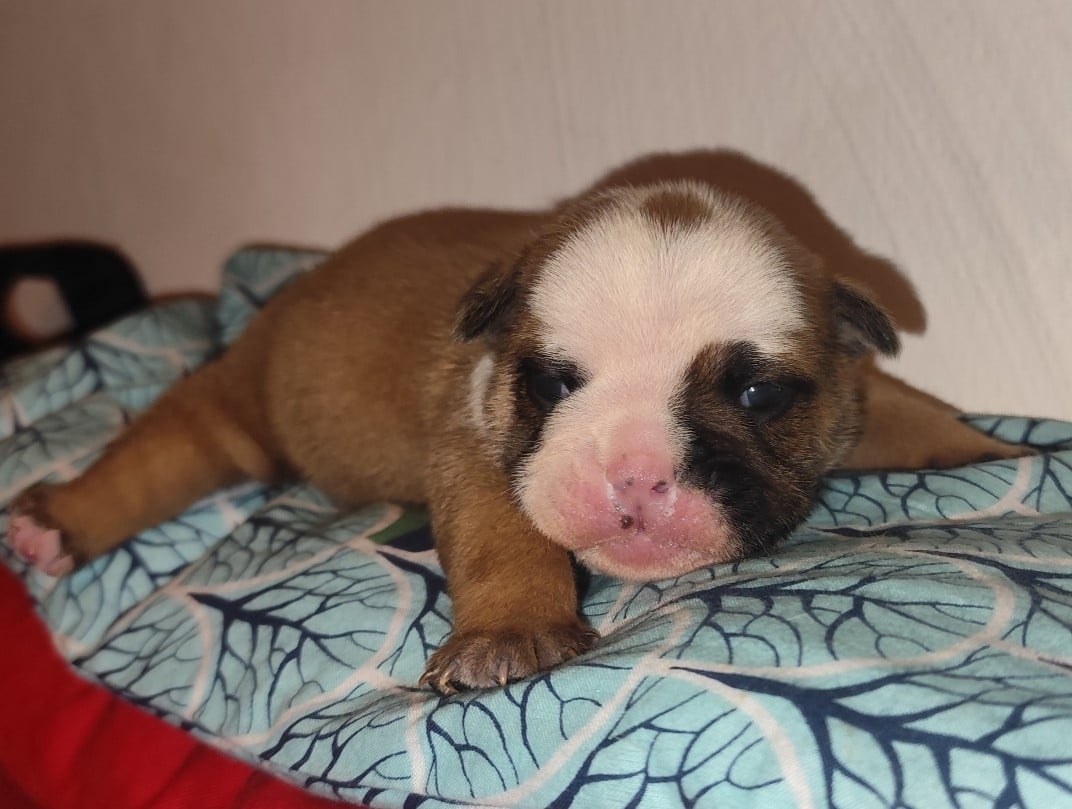 Femelle Bulldog Anglais, robe fauve panachée blanc, poil ras. Née le 25 janvier 2026, poids de naissance : 364 g. lignée clos de Stefanel Issue d une portée suivie avec attention, elle présente une jolie répartition de couleur avec une encolure blanche bien marquée. Évolue auprès de sa mère dans un environnement familial calme et sécurisé. Des nouvelles et photos seront partagées au fil de son évolution.