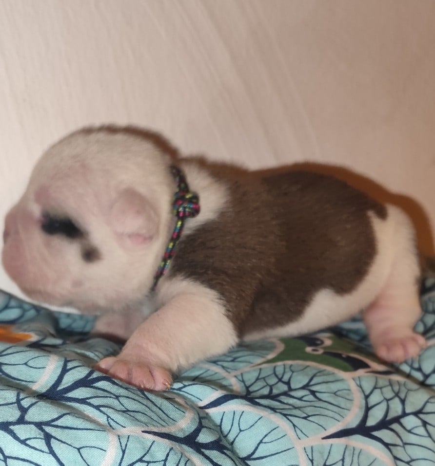 ContactBradley Dean des Bulles de la Riviera Mâle bulldog anglais au pelage fauve panaché de blanc, avec une tête majoritairement blanche et une petite marque foncée au niveau d un il, lui apportant beaucoup de charme. Chiot bien construit, avec une belle ossature dès la naissance. Lignée clos de stefanel Poids de naissance : 403 g.
