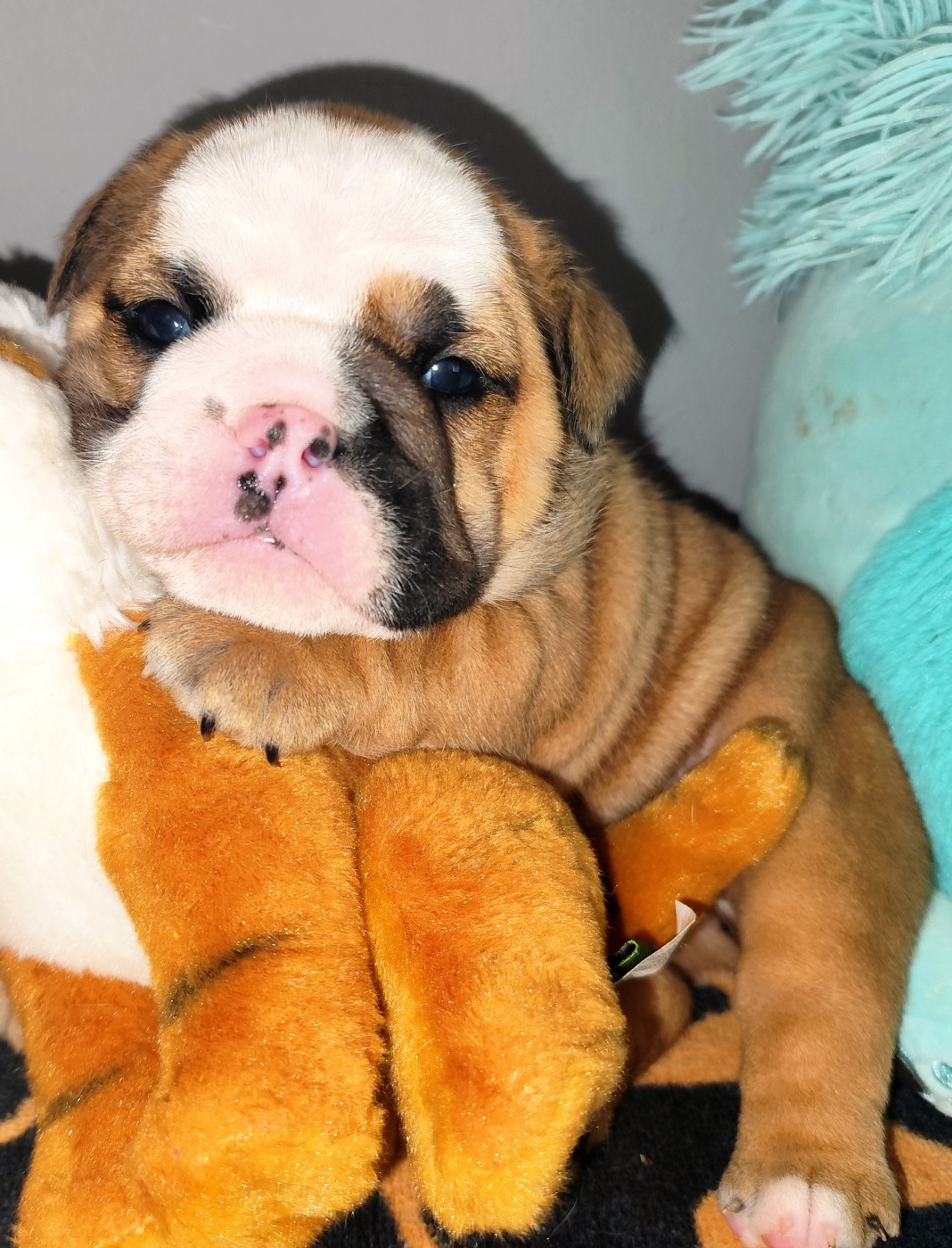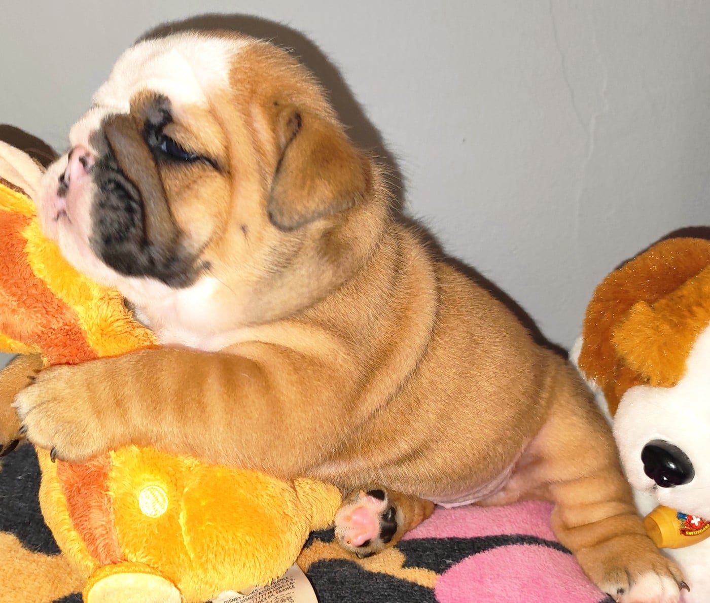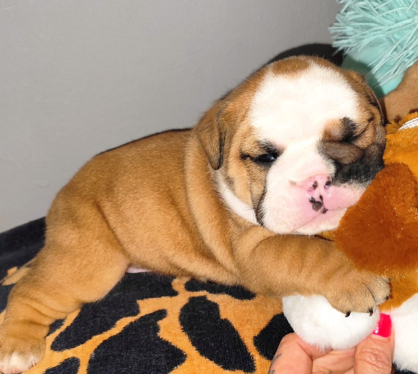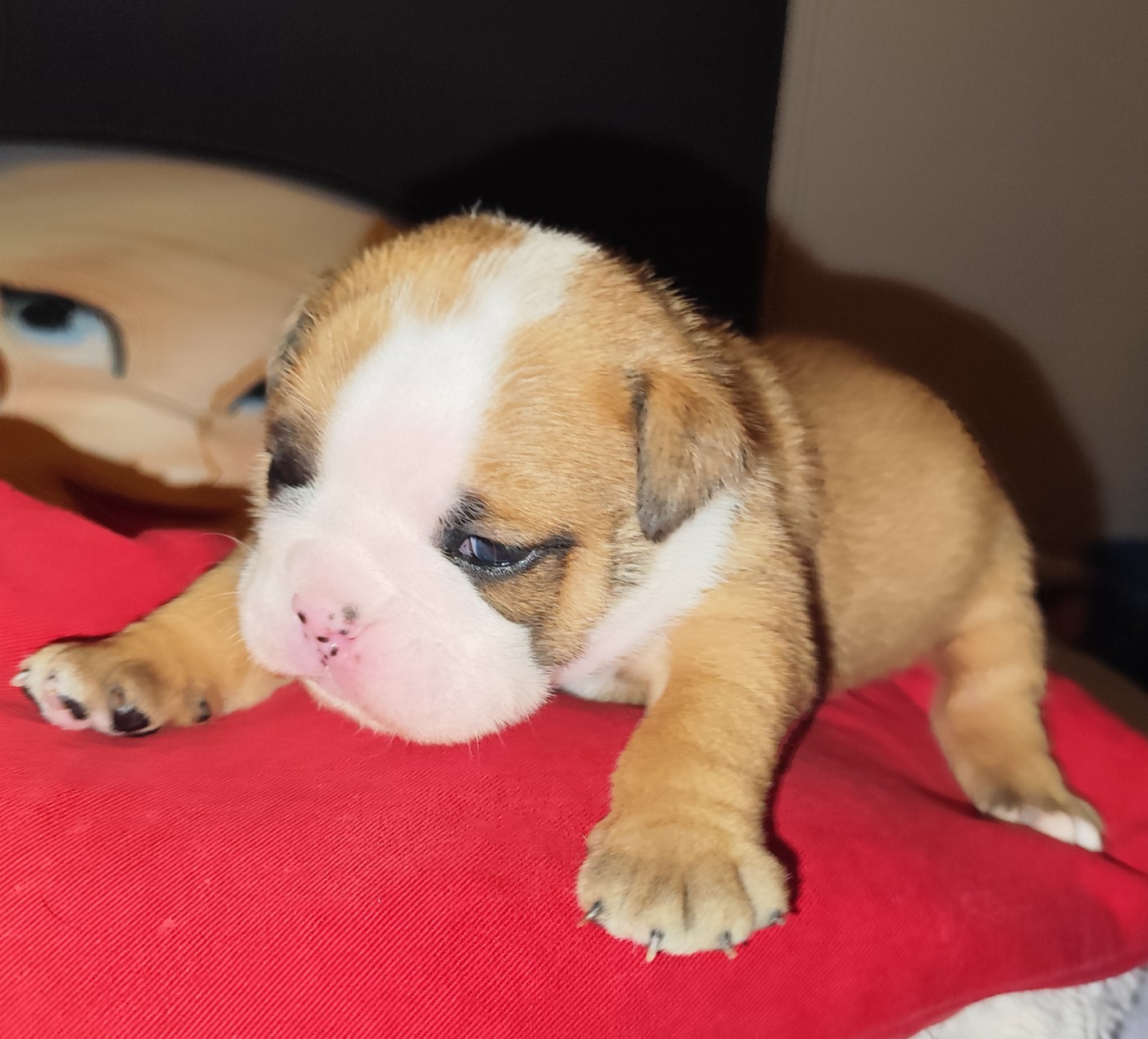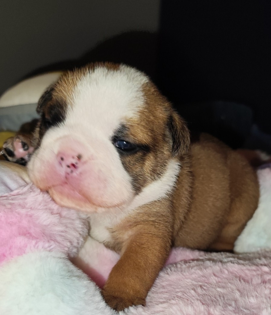 Briana Hopp est une jolie femelle Bulldog Anglais, bien typée dès la naissance, avec un poids de 371g . Elle présente une belle robe fauve panachée de blanc, avec une pigmentation déjà bien marquée. Son corps est compact et harmonieux, avec une ossature solide et un dos bien proportionné. lignée clos de stefanel